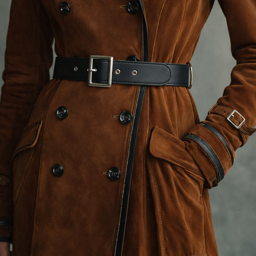 Un cappotto lungo in texture effetto suede dal design doppiopetto con cintura in vita. Valorizza la silhouette grazie ai dettagli sartoriali ed è perfetto per un look elegante e quotidiano nelle stagioni fredde.